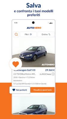 Con Autohero, la tua soddisfazione è la nostra priorità. Per questo, ti offriamo una garanzia di rimborso entro 21 giorni: prova la tua auto e, se non rispecchia perfettamente le tue aspettative o il tuo stile di vita, puoi semplicemente restituirla. Il pagamento avviene solo al momento della consegna o del ritiro, con opzioni di finanziamento sicure e personalizzabili, oltre alla possibilità di permutare comodamente la tua vecchia auto. L'applicazione Autohero eleva l'esperienza di acquisto con funzionalità esclusive: una schermata Home personalizzata, notifiche istantanee sulle riduzioni di prezzo, accesso prioritario alle nuove offerte, la libertà di salvare un numero illimitato di veicoli preferiti e la sincronizzazione delle ricerche effettuate sul web.