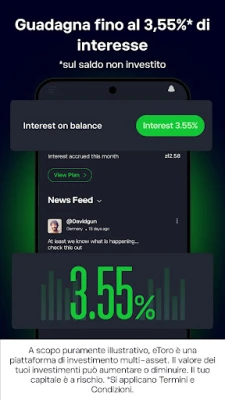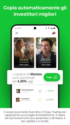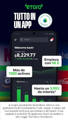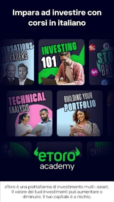 eToro va oltre il semplice trading online; è una vivace comunità dove puoi connetterti, condividere idee e affinare le tue strategie con altri investitori. Sfrutta il potere della collaborazione e scopri la nostra premiata tecnologia CopyTrader™. Questa funzione rivoluzionaria ti permette di replicare in modo automatico le operazioni dei trader di successo, allineando il tuo portafoglio alle scelte dei migliori performer della piattaforma. Vuoi familiarizzare con le funzionalità di eToro senza alcun impegno? Crea un nuovo account e riceverai un portafoglio virtuale di 100.000$ per esplorare ogni aspetto della piattaforma e testare le tue strategie in un ambiente completamente privo di rischi.