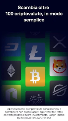 Esplora il mondo degli investimenti con eToro, la piattaforma che ti apre le porte a un'ampia gamma di opportunità finanziarie. Scegli tra migliaia di azioni quotate sulle venti principali borse globali, con la facilità di un'interfaccia intuitiva e pensata per tutti. Non solo azioni: eToro è il tuo partner affidabile per l'acquisto di criptovalute. Forte della sua esperienza pionieristica nel fintech, ti offre accesso a un vasto ecosistema di asset digitali come Bitcoin, Ethereum, XRP e molti altri, con la comodità di svariate modalità di versamento e l'assenza di commissioni sui depositi. Ricorda che gli investimenti in criptovalute sono volatili e comportano un elevato rischio di perdita del capitale.