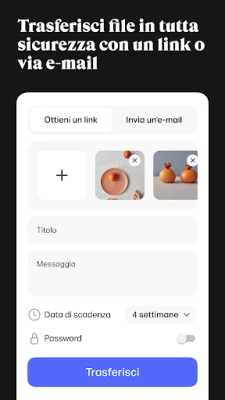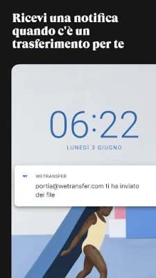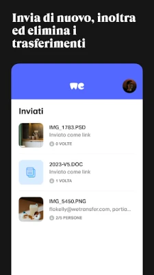 WeTransfer rende semplice inviare e ricevere file di grandi dimensioni, fino a 200 GB. Condividi foto e video nella loro qualità originale, con tutti i dettagli. Controlla e gestisci i tuoi trasferimenti dal telefono, ricevi notifiche intelligenti e accedi ai file ovunque tu sia.